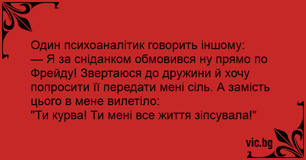 — Я за сніданком обмовився ну прямо по Фрейду! Звертаюся до дружини й хочу попросити її передати мені сіль. А замість цього в мене вилетіло:
