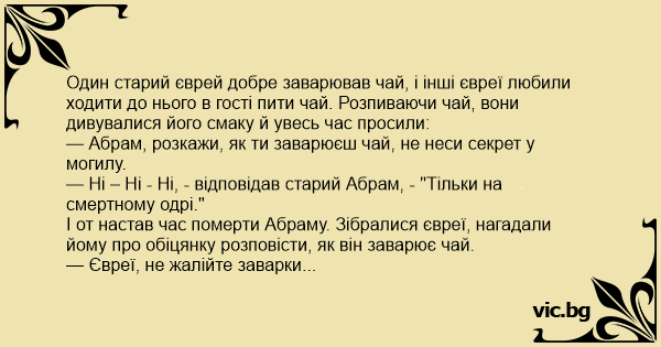 — Абрам, розкажи, як ти заварюєш чай, не неси секрет у могилу.