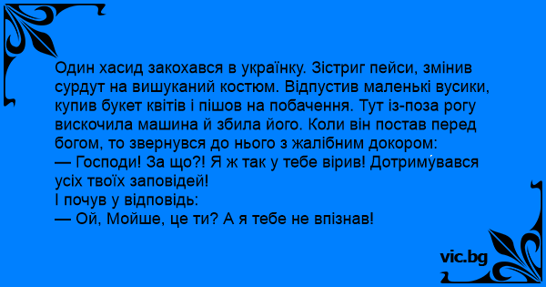 Один хасид закохався в українку. Зістриг пейси, змінив сурдут на вишуканий костюм. Відпустив маленькі вусики, купив букет квітів і пішов на побачення. Тут із-поза рогу вискочила машина й збила його. Коли він постав перед богом, то звернувся до нього з жалібним докором: