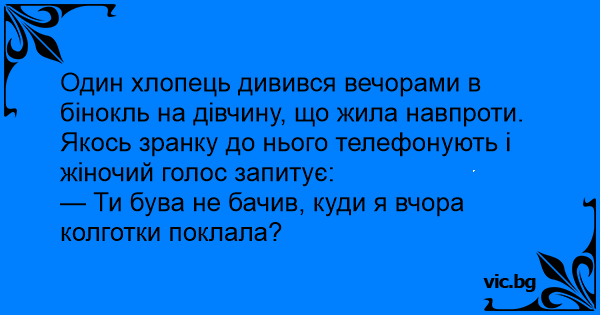 Один хлопець дивився вечорами в бінокль на дівчину, що жила навпроти. Якось зранку до нього телефонують і жіночий голос запитує: