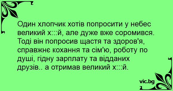 Български English Deutsch Español Русский Français Italiano Ελληνικά Македонски Türkçe Один хлопчик хотів попросити у небес великий х:::й, але дуже вже соромився. Тоді він попросив щастя та здоров'я, справжнє кохання та сім'ю, роботу по душі, гідну зарплату та відданих друзів.. а... Português Polski Svenska Nederlands Dansk Norsk Suomi Magyar Româna Čeština Lietuvių Latviešu Hrvatski