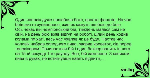 Один чоловік дуже полюбляв бокс, просто фанатів. На час боїв життя зупинялася, жив як кажуть від бою до бою.