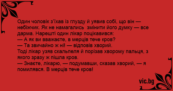 — Знаєте, лікарю, — подумавши, сказав хворий, — я помилявся. В мерців тече кров!