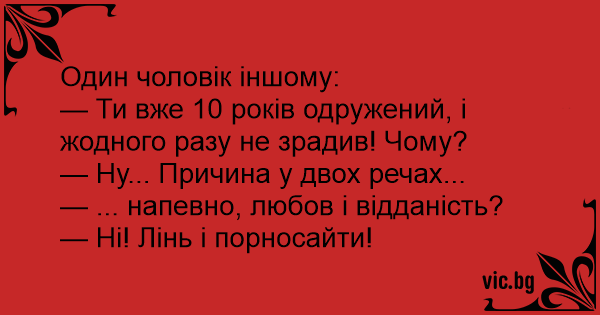 — Ти вже 10 років одружений, і жодного разу не зрадив! Чому?