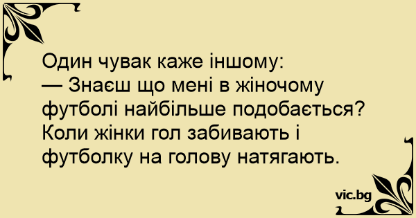 Один чувак каже іншому: — Знаєш що мені в жіночому футболі найбільше подобається? Коли жінки гол забивають і футболку на голову натягають.