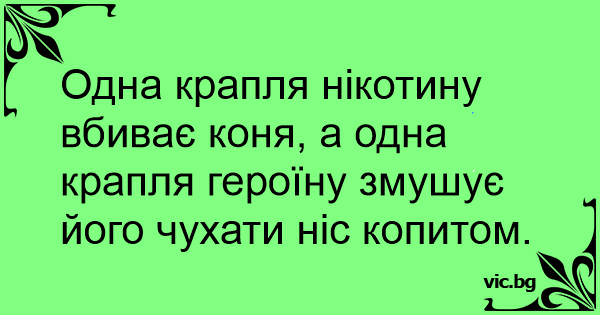 Одна крапля нікотину вбиває коня, а одна крапля героїну змушує його чухати ніс копитом.