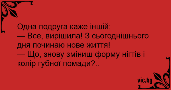 — Все, вирішила! З сьогоднішнього дня починаю нове життя!