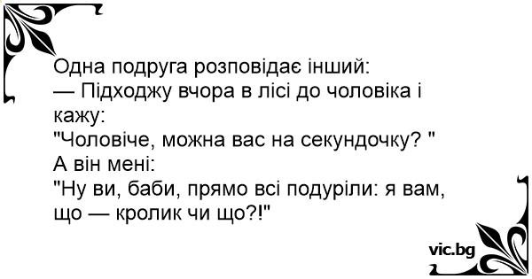 — Підходжу вчора в лісі до чоловіка і кажу: