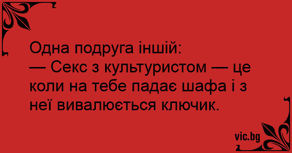 Одна подруга іншій:<br />— Cekc з культуристом — це коли на тебе падає шафа і з неї вивалюється ключик.