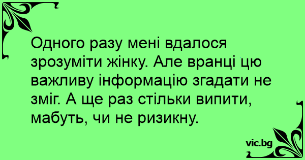 Одного разу мені вдалося зрозуміти жінку. Але вранці цю важливу інформацію згадати не зміг. А ще раз стільки випити, мабуть, чи не ризикну.