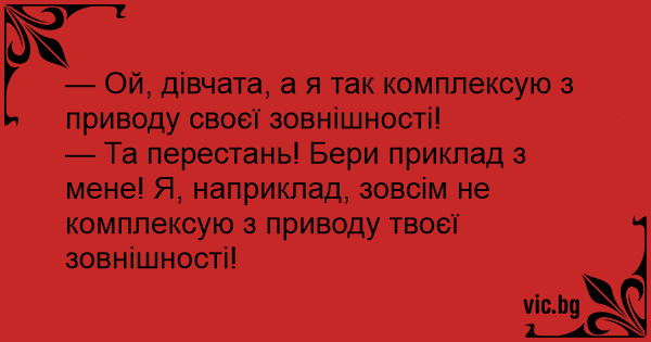 — Та перестань! Бери приклад з мене! Я, наприклад, зовсім не комплексую з приводу твоєї зовнішності!