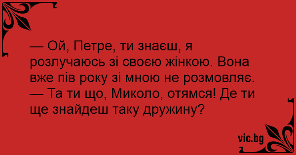 — Ой, Петре, ти знаєш, я розлучаюсь зі своєю жінкою. Вона вже пів року зі мною не розмовляє.