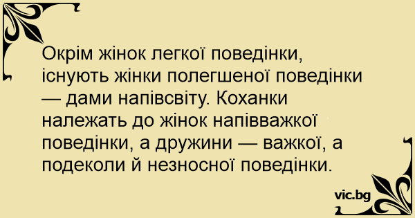 Окрім жінок легкої поведінки, існують жінки полегшеної поведінки — дами напівсвіту. Коханки належать до жінок напівважкої поведінки, а дружини — важкої, а подеколи й незносної поведінки.