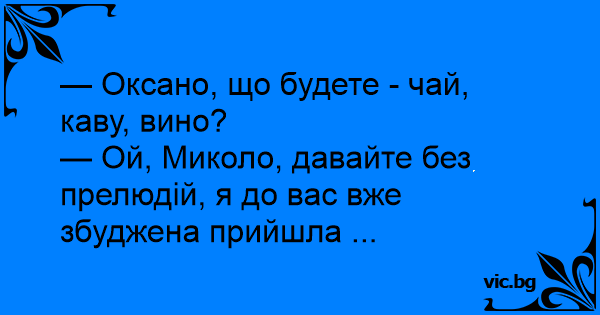 — Ой, Миколо, давайте без прелюдій, я до вас вже збуджена прийшла ...