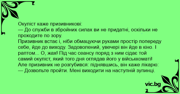 Призивник встає і, ніби обмацуючи руками простір попереду себе, йде до виходу. Задоволений, увечері він йде в кіно. І раптом... О, жах! Під час сеансу поряд з ним сідає той самий окуліст, який того дня оглядав його у військкоматі! Але призивник не розгубився: піднявшись, він каже лікарю: