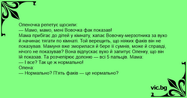 — Мамо, мамо, мені Вовочка фак показав!