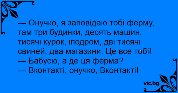 Stará babička umírá. Říká vnučce: „Odkazuji ti svou farmu. Všechna zvířata, rostliny, obráběcí stroje, a k tomu ještě 1,237,896 dolarů.” Vnučka se ptá: „A kde ta farma je?” A babička s posledním...