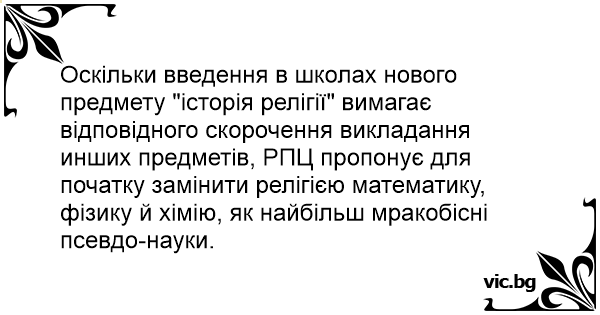 Оскільки введення в школах нового предмету "історія релігії" вимагає відповідного скорочення викладання инших предметів, РПЦ пропонує для початку замінити релігією математику, фізику й хімію, як найбільш мракобісні псевдо-науки.