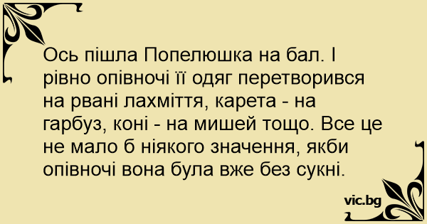 Ось пішла Попелюшка на бал. І рівно опівночі її одяг перетворився на рвані лахміття, карета - на гарбуз, коні - на мишей тощо. Все це не мало б ніякого значення, якби опівночі вона була вже без сукні.