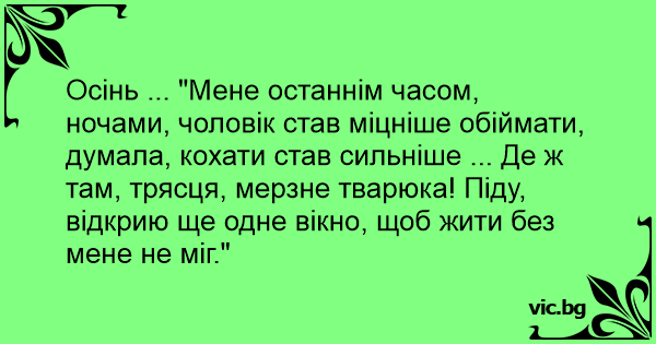 Осінь ... "Мене останнім часом, ночами, чоловік став міцніше обіймати, думала, кохати став сильніше ... Де ж там, трясця, мерзне тварюка! Піду, відкрию ще одне вікно, щоб жити без мене не міг."