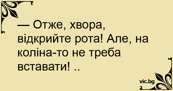 — Отже, хвора, відкрийте рота! Але, на коліна-то не треба вставати! ..