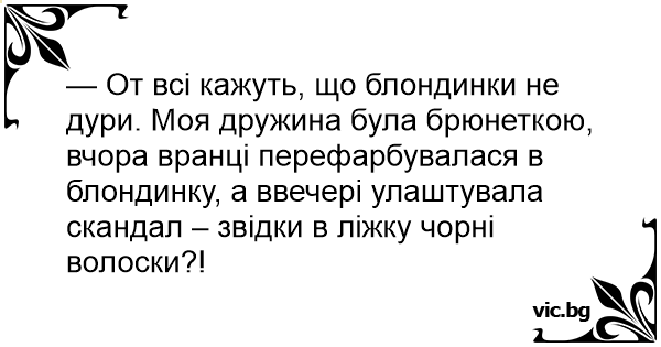 — От всі кажуть, що блондинки не дури. Моя дружина була брюнеткою, вчора вранці перефарбувалася в блондинку, а ввечері улаштувала скандал – звідки в ліжку чорні волоски?!