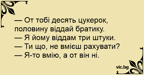 — От тобі десять цукерок, половину віддай братику.