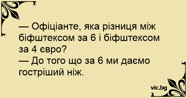 — Офіціанте, яка різниця між біфштексом за 6 і біфштексом за 4 євро?