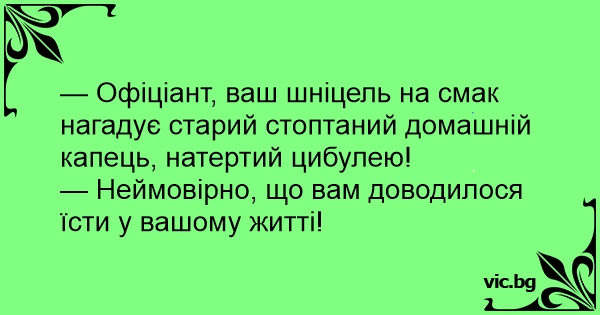 — Офіціант, ваш шніцель на смак нагадує старий стоптаний домашній капець, натертий цибулею!