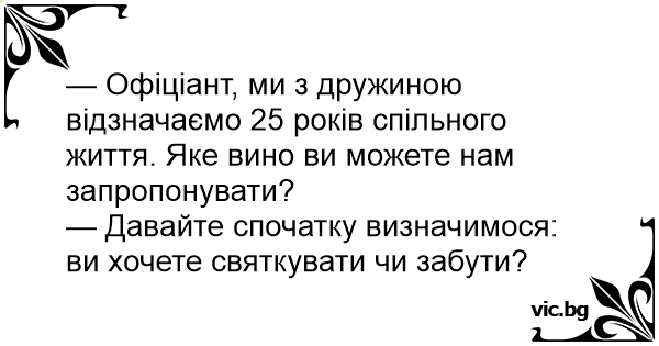 — Офіціант, ми з дружиною відзначаємо 25 років спільного життя. Яке вино ви можете нам запропонувати?