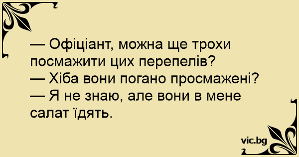 — Офіціант, можна ще трохи посмажити цих перепелів?
