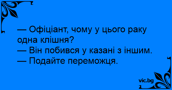 — Офіціант, чому у цього раку одна клішня?