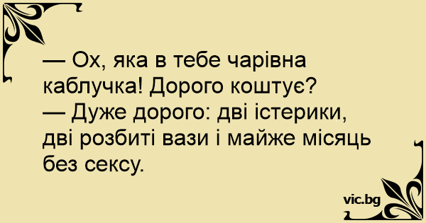 — Дуже дорого: дві істерики, дві розбиті вази і майже місяць без сексу.