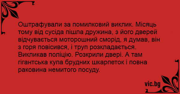 Оштрафували за помилковий виклик. Місяць тому від сусіда пішла дружина, з його дверей відчувається моторошний сморід, я думав, він з горя повісився, і труп розкладається. Викликав поліцію. Розкрили двері. А там гігантська купа брудних шкарпеток і повна раковина немитого посуду.