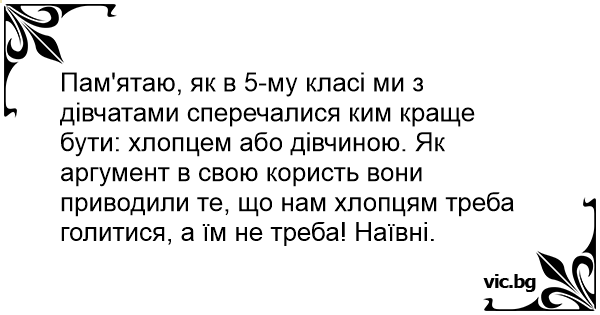 Пам'ятаю, як в 5-му класі ми з дівчатами сперечалися ким краще бути: хлопцем або дівчиною. Як аргумент в свою користь вони приводили те, що нам хлопцям треба голитися, а їм не треба! Наївні.
