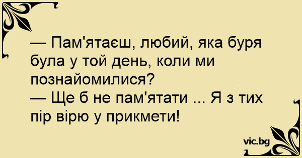 — Пам'ятаєш, любий, яка буря була у той день, коли ми познайомилися?