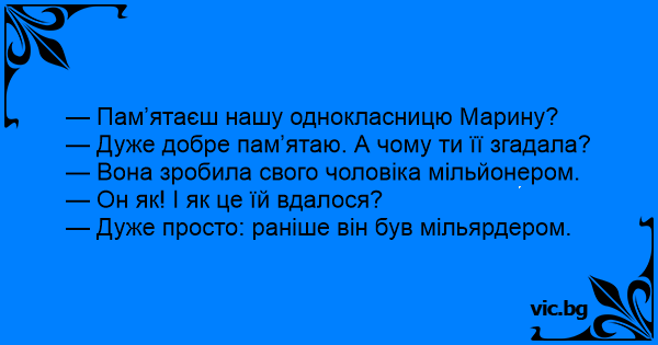 Се фали една жена на друга: - Од мојот маж направив милионер. - А што беше пред тоа? - Милијардер.