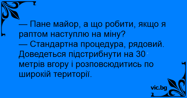 - Ponas karininke, o ką daryti, jei aš užlipsiu ant minos? - Standartinius veiksmus: pašokti 30 metrų į viršų, o paskui išsisklaidyti po teritoriją!