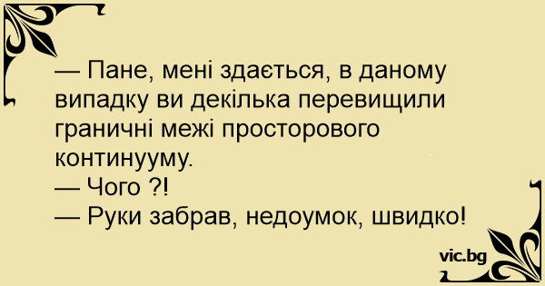— Пане, мені здається, в даному випадку ви декілька перевищили граничні межі просторового континууму.