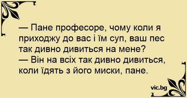 — Пане професоре, чому коли я приходжу до вас і їм суп, ваш пес так дивно дивиться на мене?