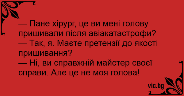 — Пане хірург, це ви мені голову пришивали після авіакатастрофи?
