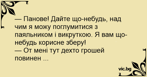 — Панове! Дайте що-небудь, над чим я можу поглумитися з паяльником і викруткою. Я вам що-небудь корисне зберу!