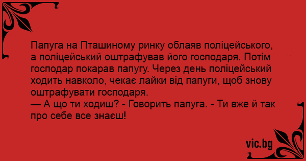 Папуга на Пташиному ринку облаяв поліцейського, а поліцейський оштрафував його господаря. Потім господар покарав папугу. Через день поліцейський ходить навколо, чекає лайки від папуги, щоб знову оштрафувати господаря.