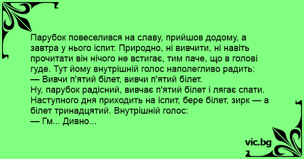 Ну, парубок радісний, вивчає п'ятий білет і лягає спати. Наступного дня приходить на іспит, бере білет, зирк — а білет тринадцятий. Внутрішній голос: