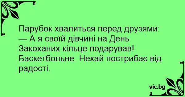 — А я своїй дівчині на День Закоханих кільце подарував! Баскетбольне. Нехай пострибає від радості.