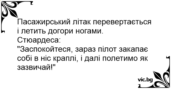 "Заспокойтеся, зараз пілот закапає собі в ніс краплі, і далі полетимо як зазвичай!"