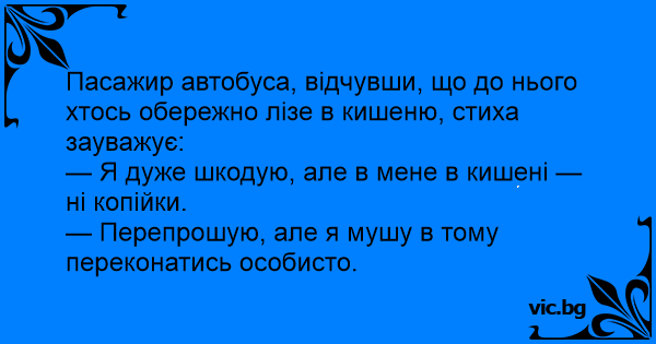 Пасажир автобуса, відчувши, що до нього хтось обережно лізе в кишеню, стиха зауважує:
