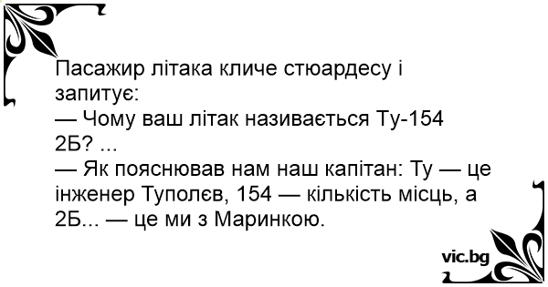 — Як пояснював нам наш капітан: Ту — це інженер Туполєв, 154 — кількість місць, а 2Б... — це ми з Маринкою.