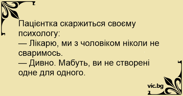 — Лікарю, ми з чоловіком ніколи не сваримось.