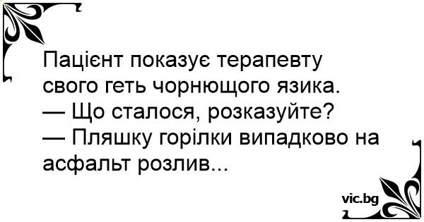 Български English Deutsch Español Русский Français Italiano Ελληνικά Македонски Türkçe Пацієнт показує терапевту свого геть чорнющого язика. — Що сталося, розказуйте? — Пляшку горілки випадково на асфальт розлив... Português Polski Svenska Nederlands Dansk Norsk Suomi Magyar Româna Čeština Lietuvių Latviešu Hrvatski